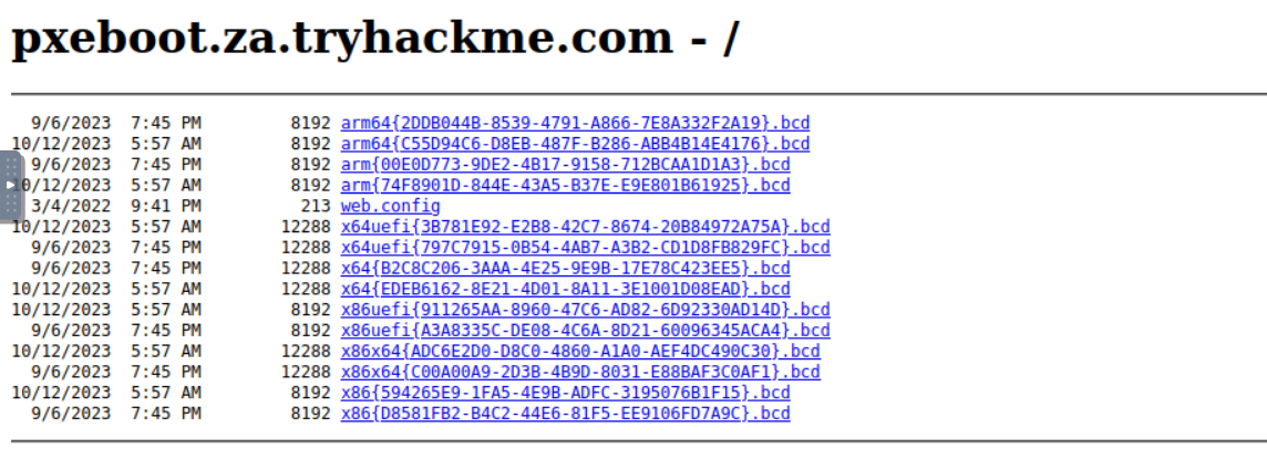 TFTP를 사용하여 이러한 각 BCD 파일을 요청하여 열거하나, 시간이 오래걸리므로 그냥 x64 BCD파일을 타겟으로 진행한다.